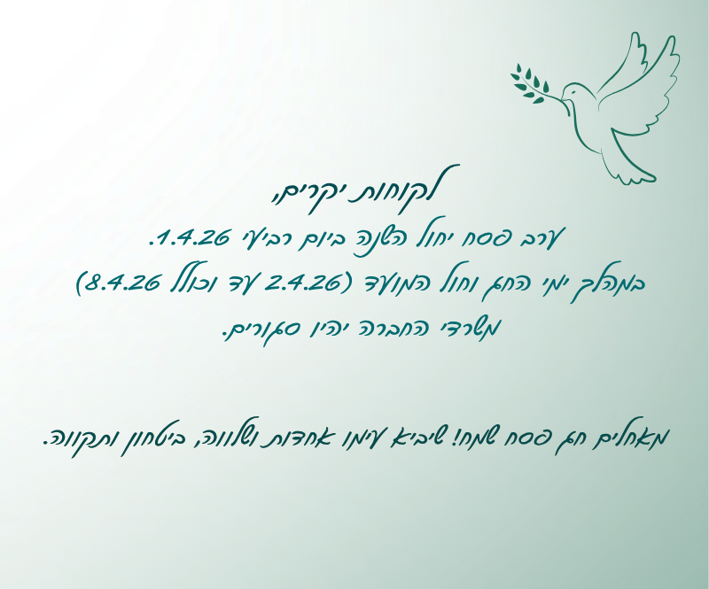אנחנו זמינים עבורכם ב-WhatsApp להתכתבות עם נציג שלחו הודעת טקסט למספר 054-6882000 או לחצו כאן השירות זמין בימים א'-ה' בין השעות 08:30 - 16:00.